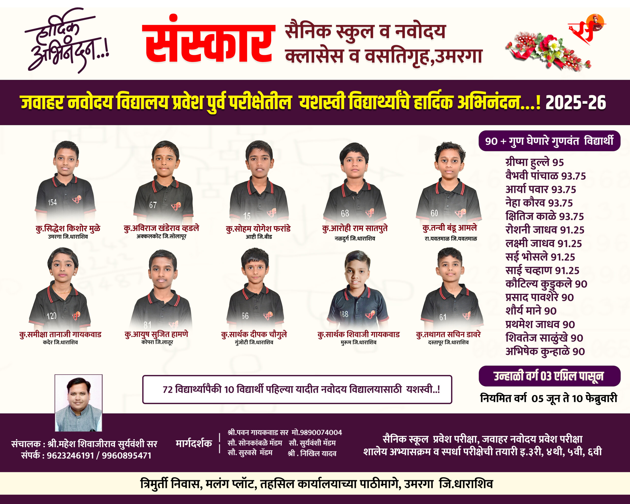 उमरगा येथील संस्कार सैनिक स्कूल व नवोदय क्लासेस चा घवघवीत यशाचा मानाचा तुरा